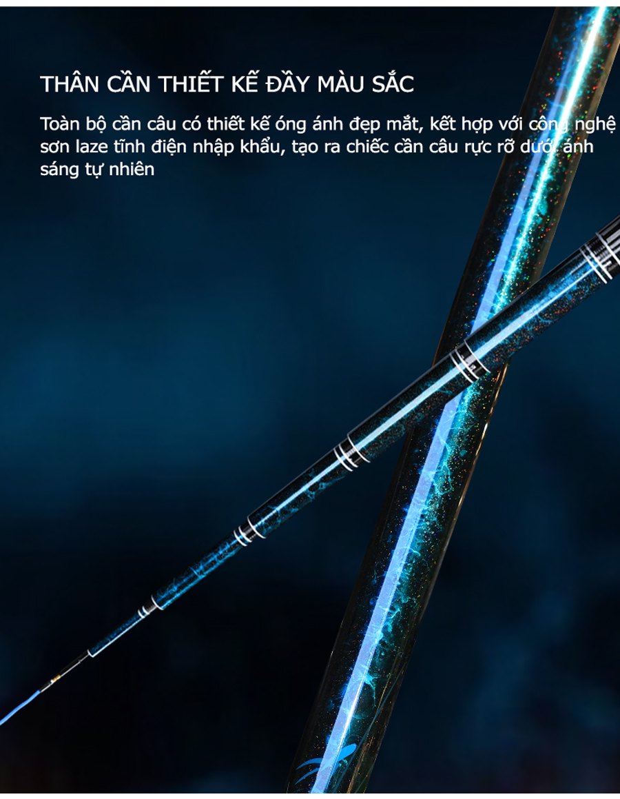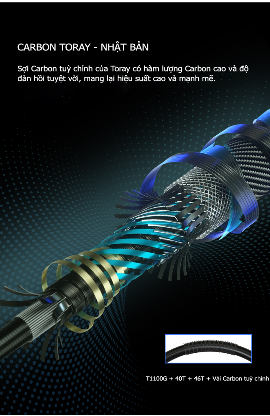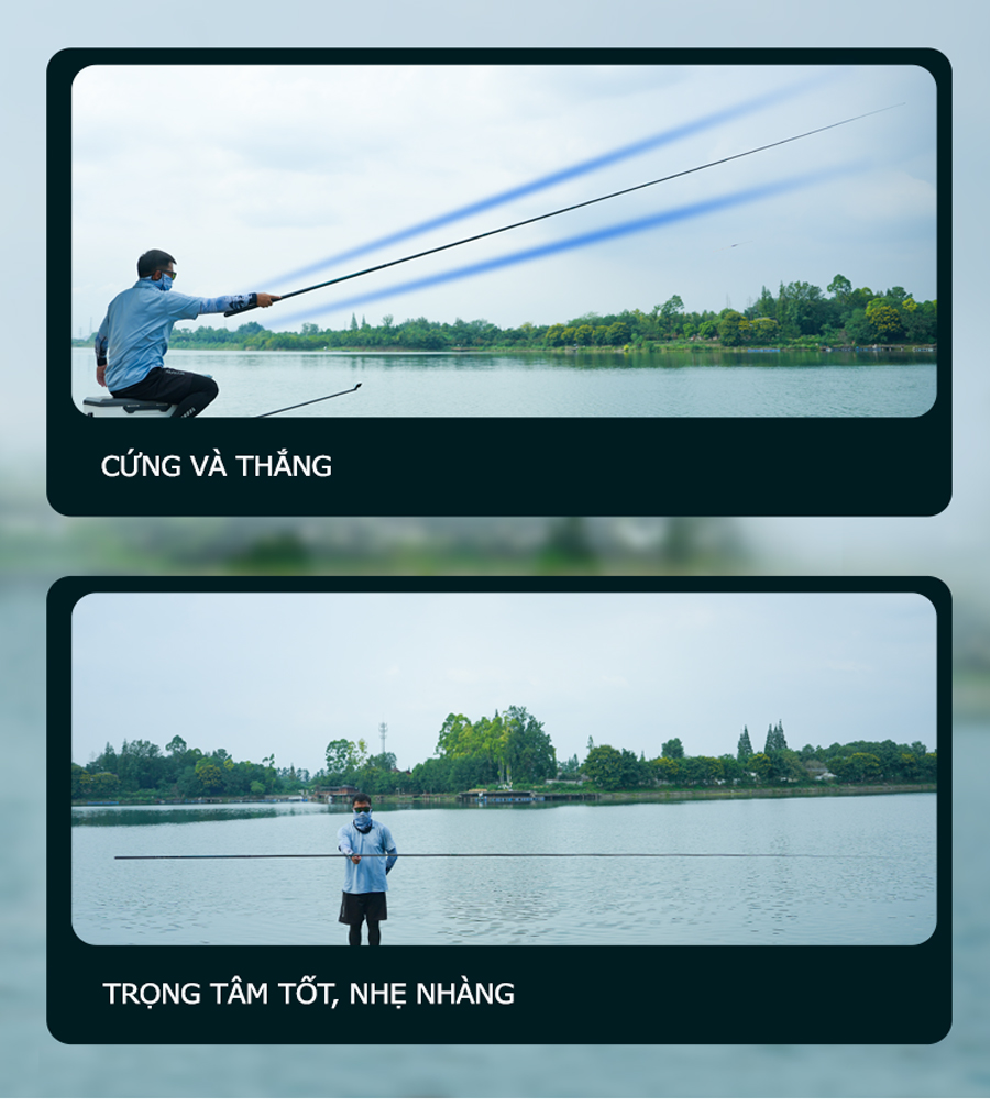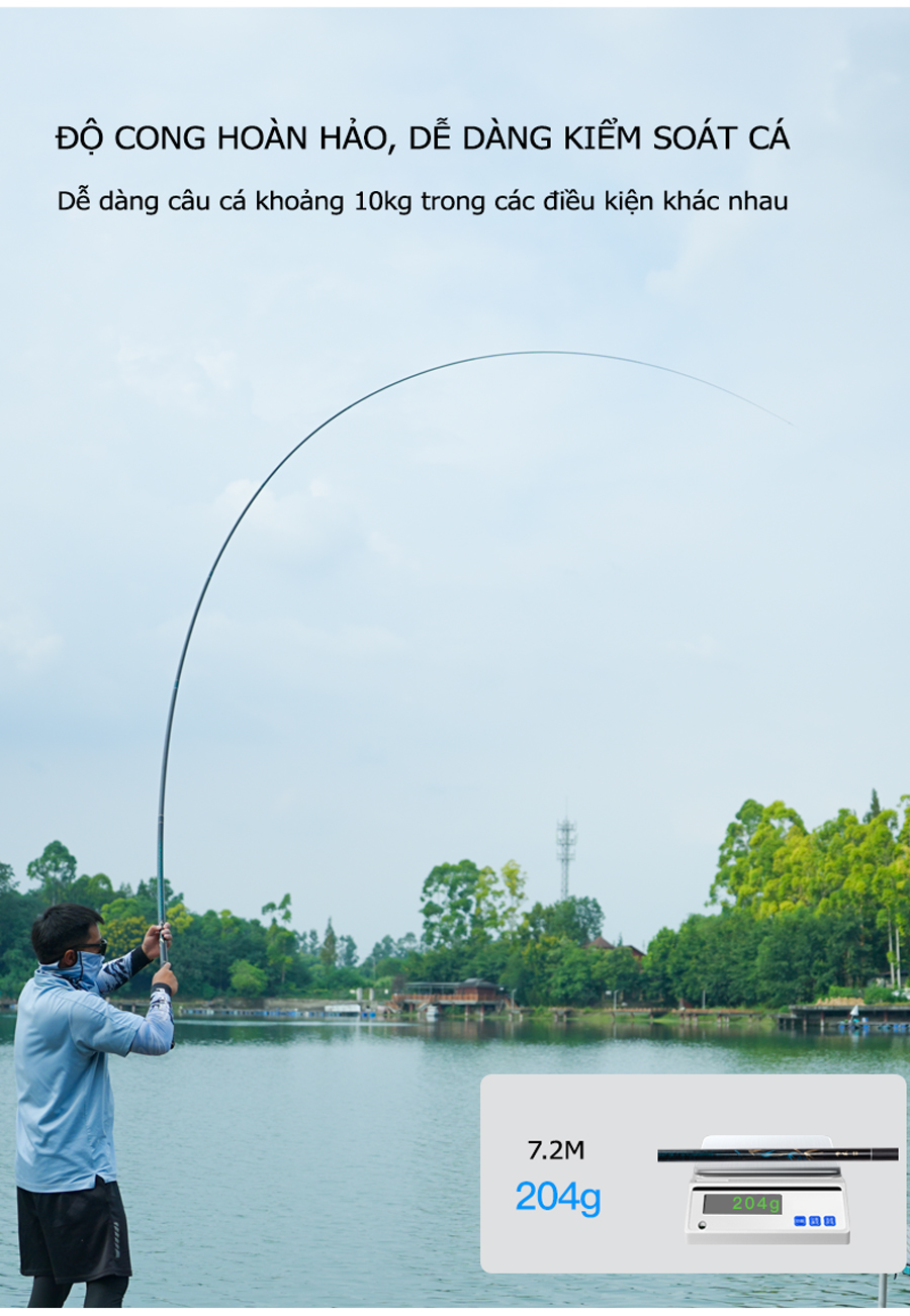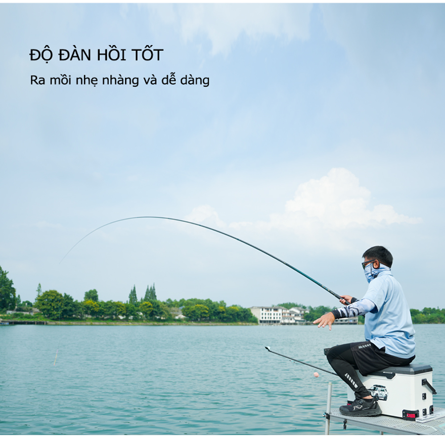 - Sử dụng vật liệu Carbon Toray T1100G + 40T + 46T + các lớp vải tuỳ chỉnh tạo nên sản phẩm nhẹ, nộ nảy cao và khả năng lên cá nhanh