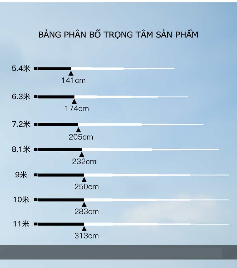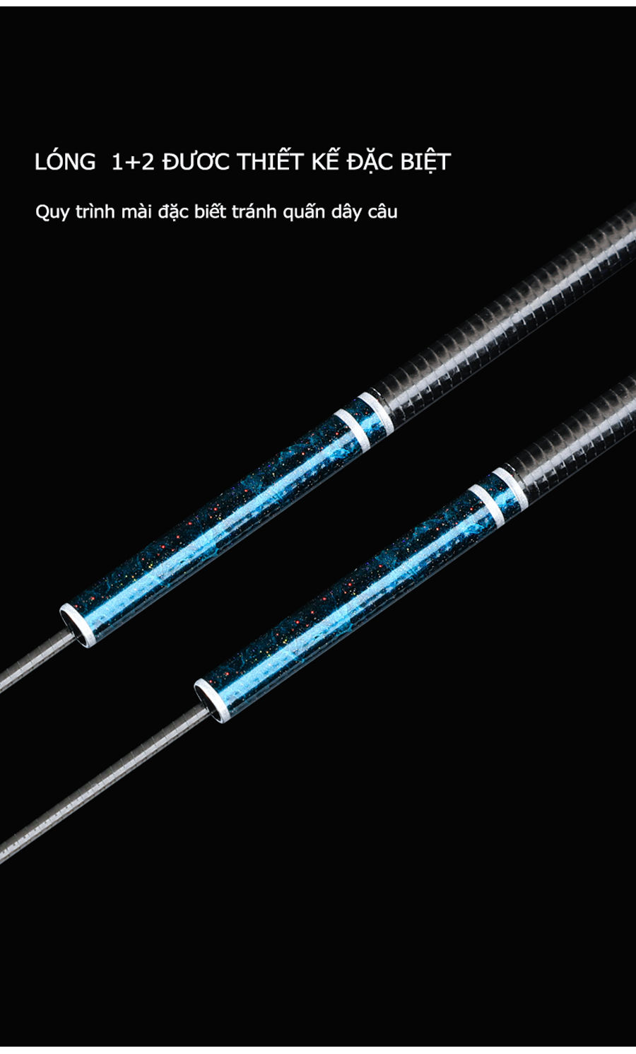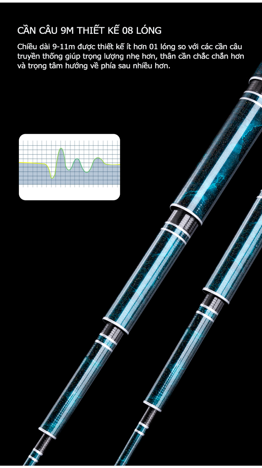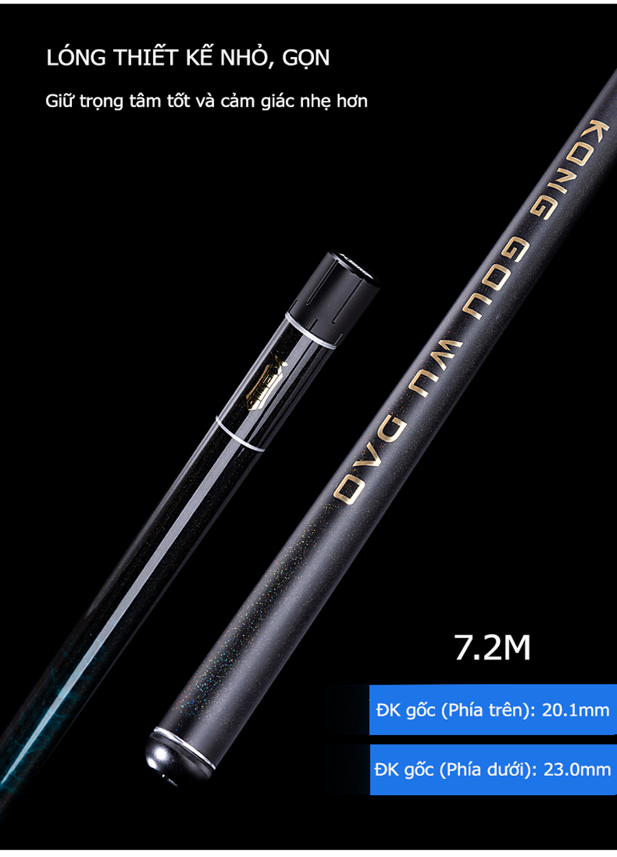 - Sử dụng vật liệu Carbon Toray T1100G + 40T + 46T + các lớp vải tuỳ chỉnh tạo nên sản phẩm nhẹ, nộ nảy cao và khả năng lên cá nhanh