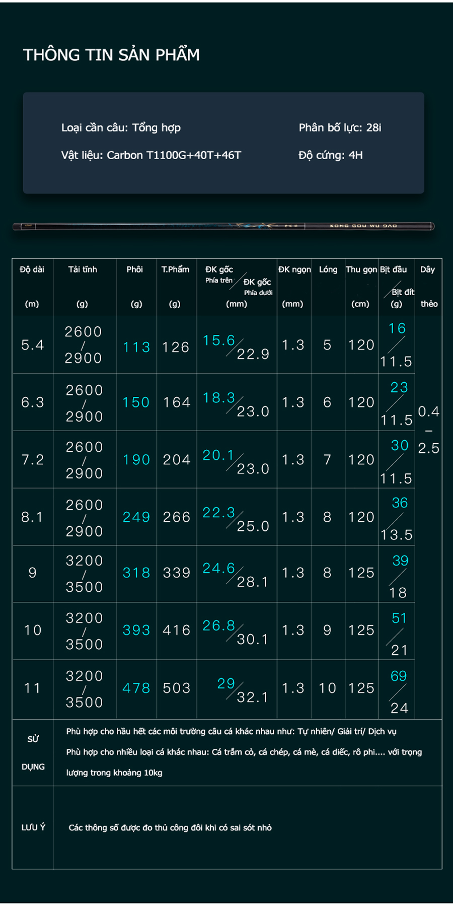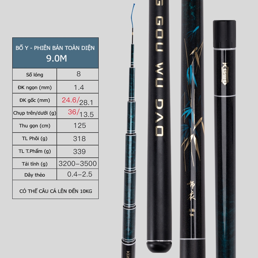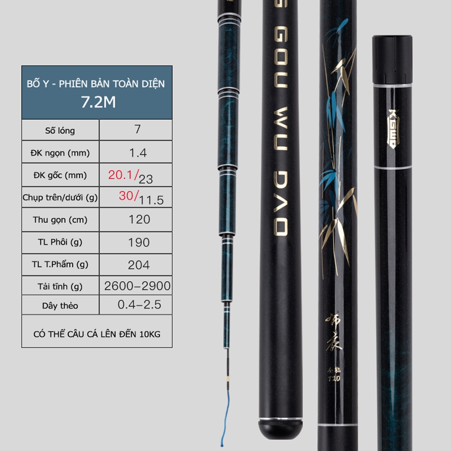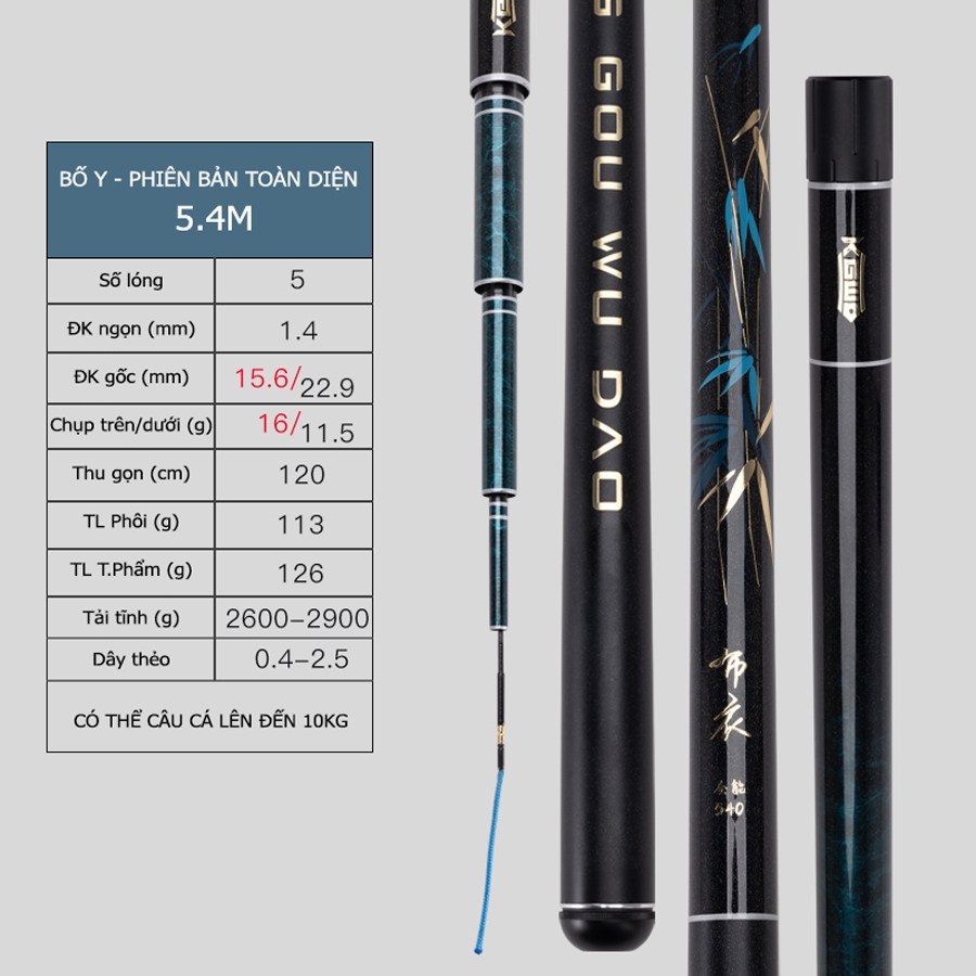 - Cần câu đài Lão Ngư Bó Y - Phiên Bản Toàn Diện được thiết kế cho mục đích câu cá tổng hợp với khả năng câu cá khoàng 10kg, thích hợp sử dụng cho các loại cá trắm, chép, diếc, rô phi...