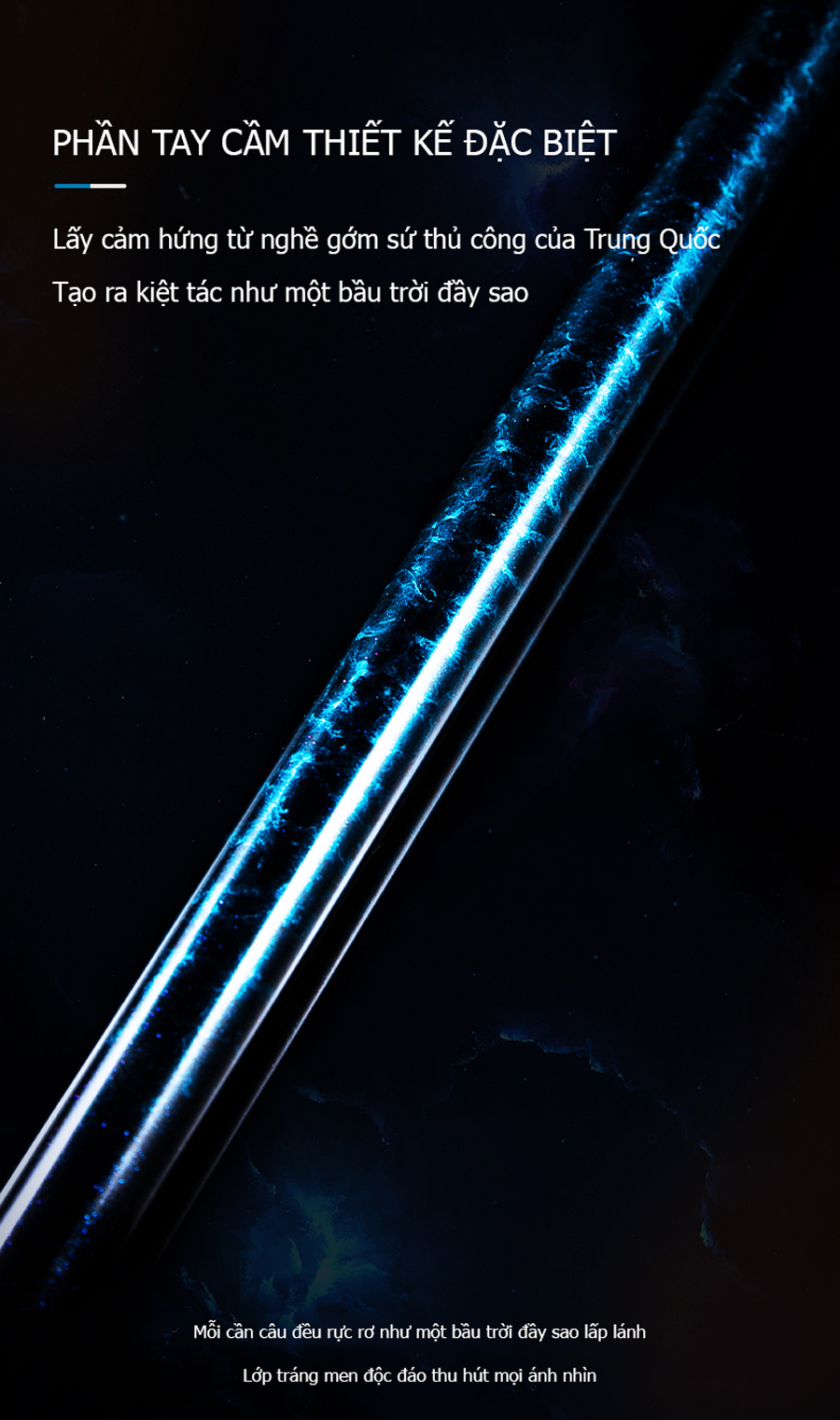 - Cần câu đài Lão Ngư Dạ Thiền sử dụng lớp tráng men đặc biệt trong nghệ thuật gốm sứ Trung Hoa tạo nên siêu phẩm với màu sắc rực rõ như một bầu trời đầy sao