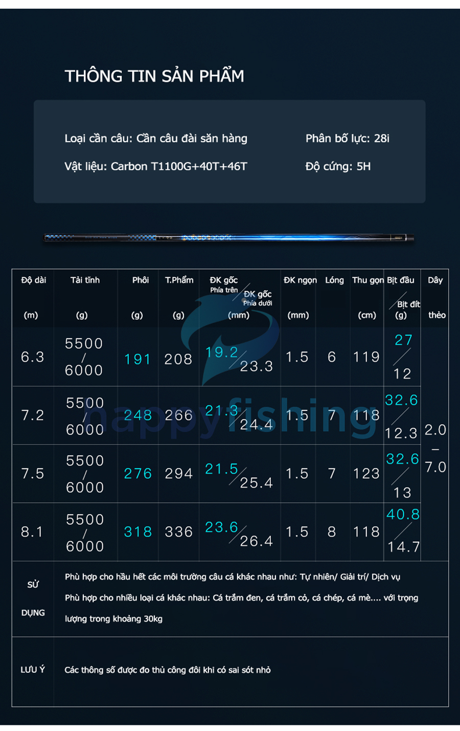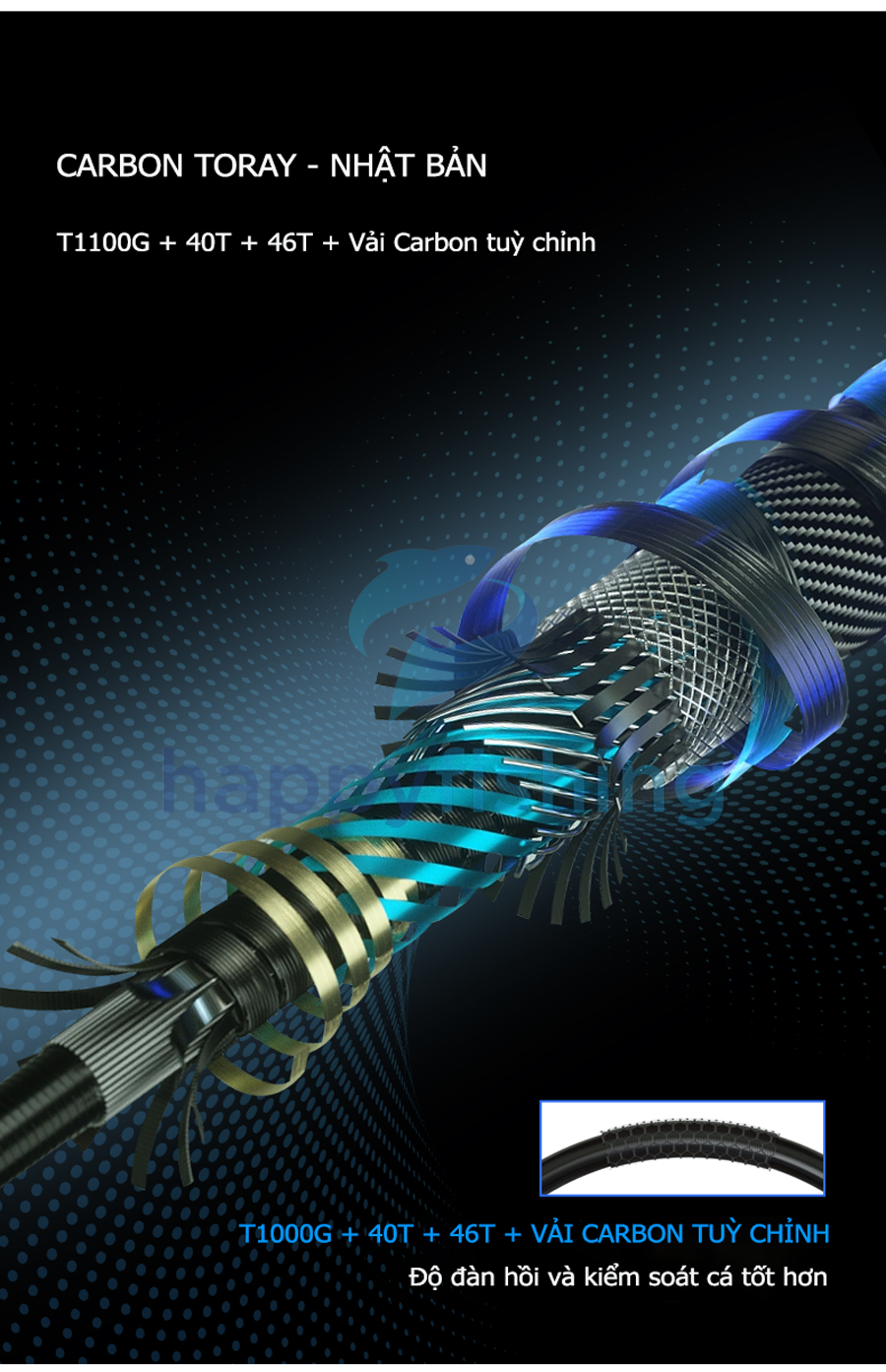 - Sử dụng vật liệu cao cấp Carbon T1100G của hãng Toray-Nhật Bản giúp cần câu có trọng lượng nhẹ, độ nảy cao và khả năng kiểm soát cá tốt hơn
