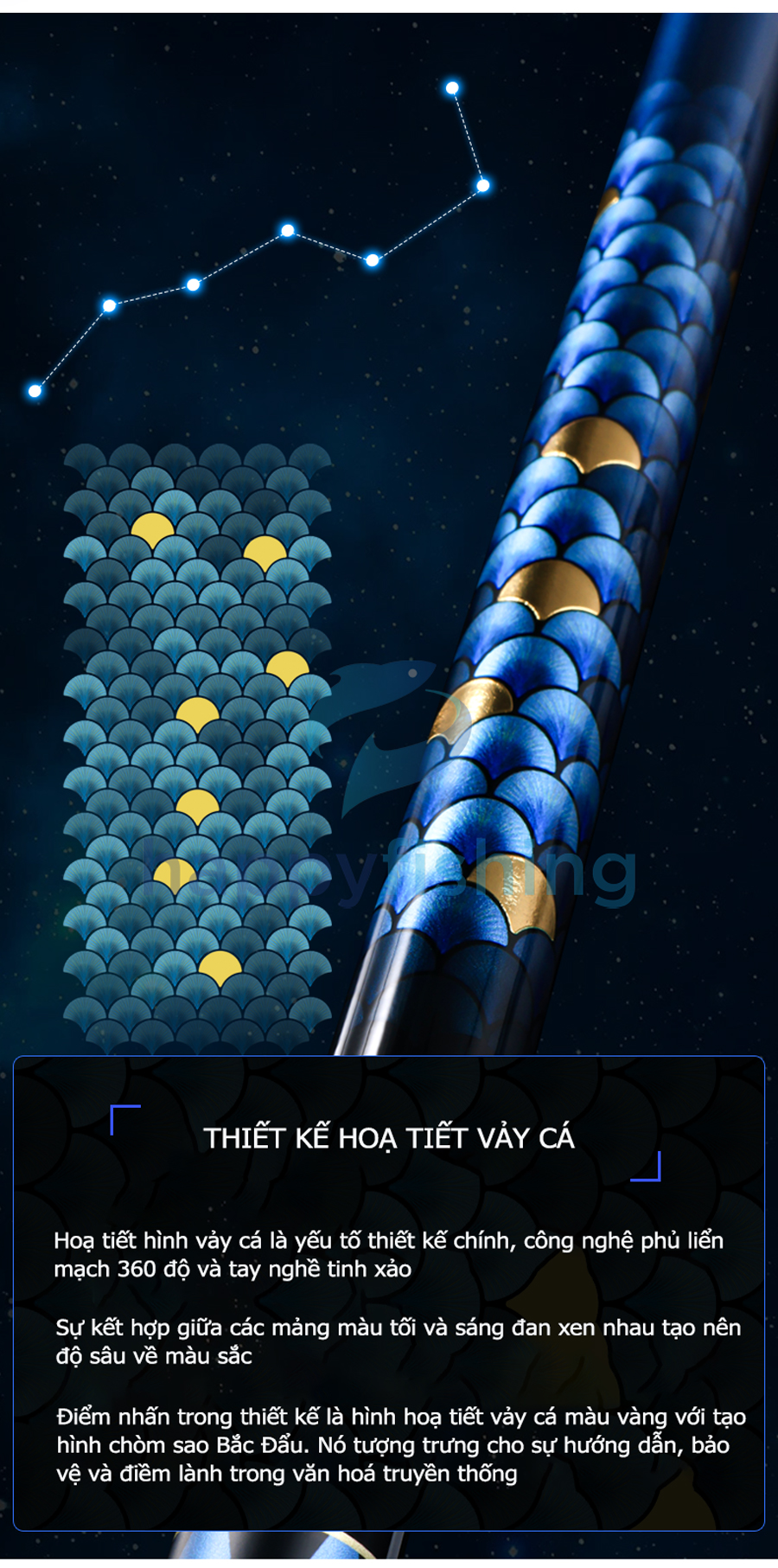 - Thiết kế màu sắc tinh tế, với hoạ tiết vảy cá trên thân cần và các mảng màu sáng tối đan xen nhau với công nghệ 3D tạo ra sản phẩm tinh tế và khác biệt. Điểm nhấn là các vảy cá màu vàng với tạo hình chòm sao Bắc Đẩu, là biểu tượng cho sự chỉ dẫn, may mắn và điềm lành trong văn hoá truyền thống