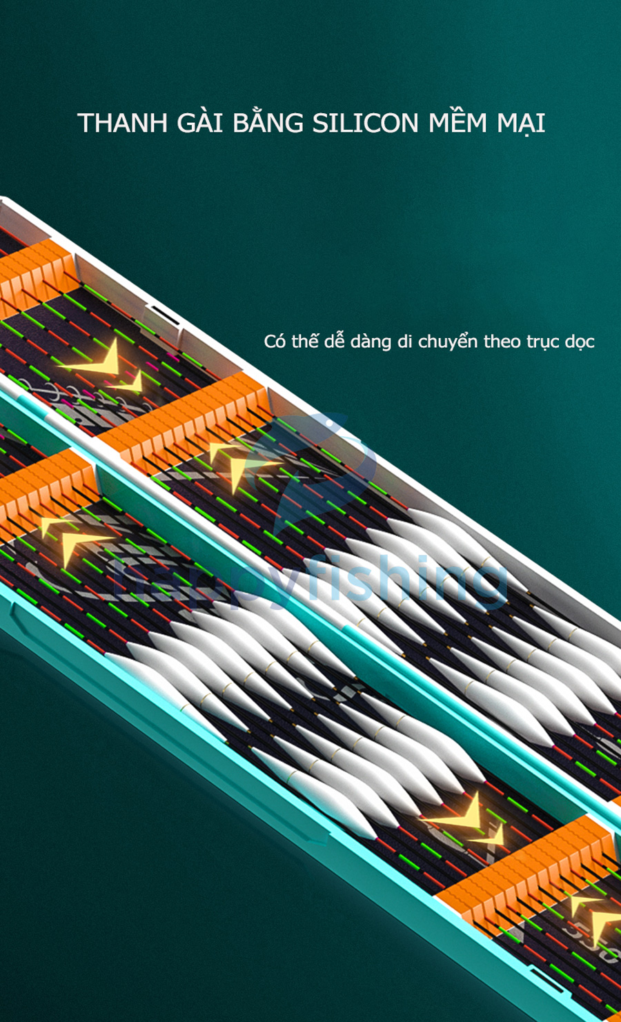 - Thiết kế ghim cài bằng Silicon mềm mại bảo vệ phao câu, có thể trượt dễ dàng theo trục dọc