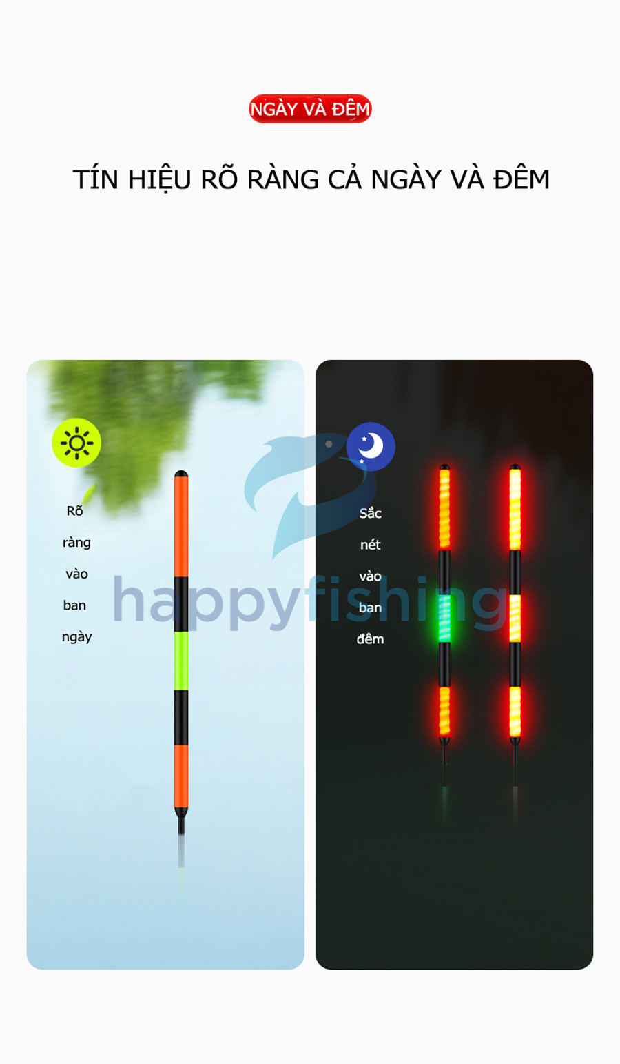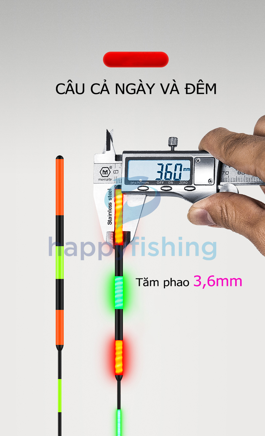 - Thiết kế tăm phao lớn săn hàng, đường kính tăm 3,6mm có thể dễ dàng quan sát trong khoảng cách 20m