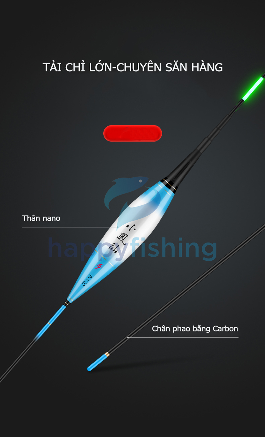 - Chân phao bằng Carbon siêu bền, vật liệu nano chế tạo thân phao cao cấp cùng với việc gia cố chắc chắc tại các điểm tiếp xúc hứa hẹn sẽ mang lại trải nghiệm tuyệt vời cho quý Cần thủ