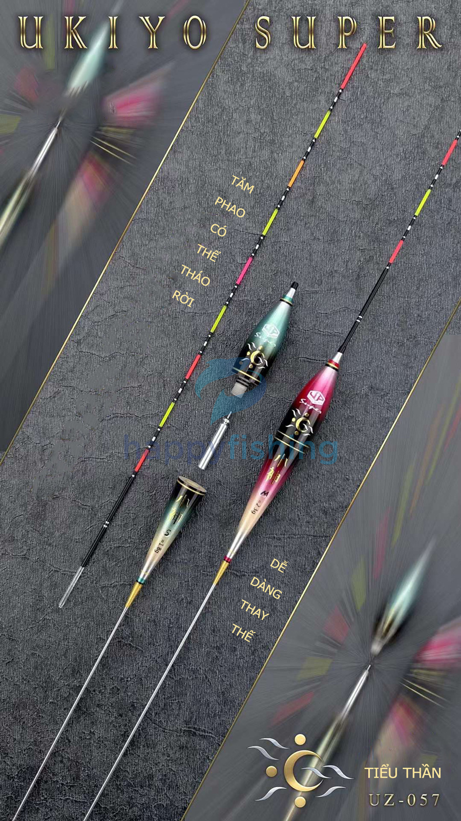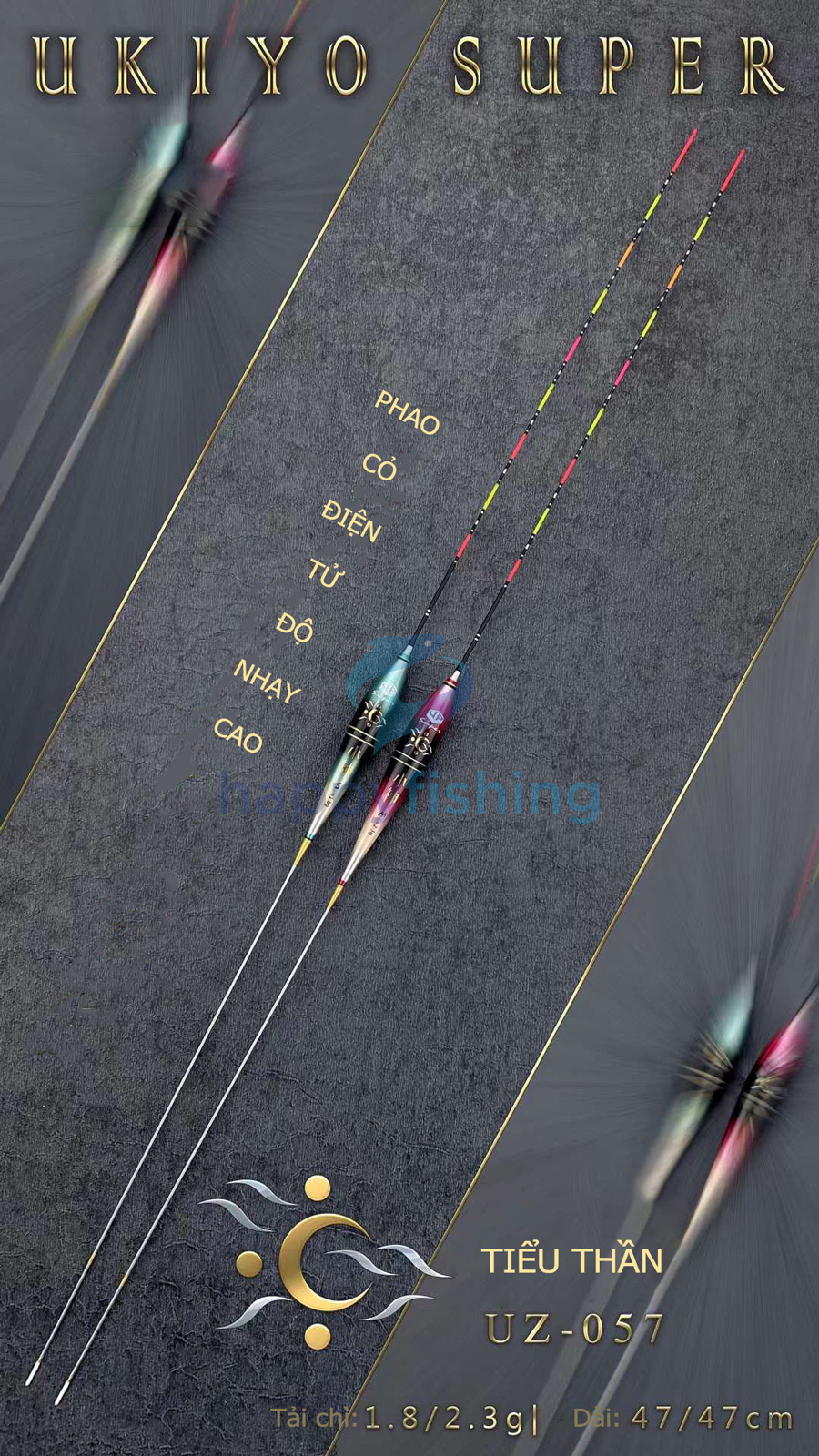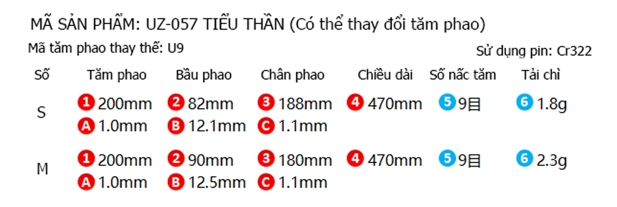 - Phao đèn câu đêm cao cấp UKIYO UZ-057 Tiểu Thần được thiết kế cho mục đích câu cá tổng hợp, câu cá chép với chiều dài 47cm và tải chỉ cho 2 kích thước S và M sau khi đã gắn pin lần lượt là 1.8g và 2.3g.