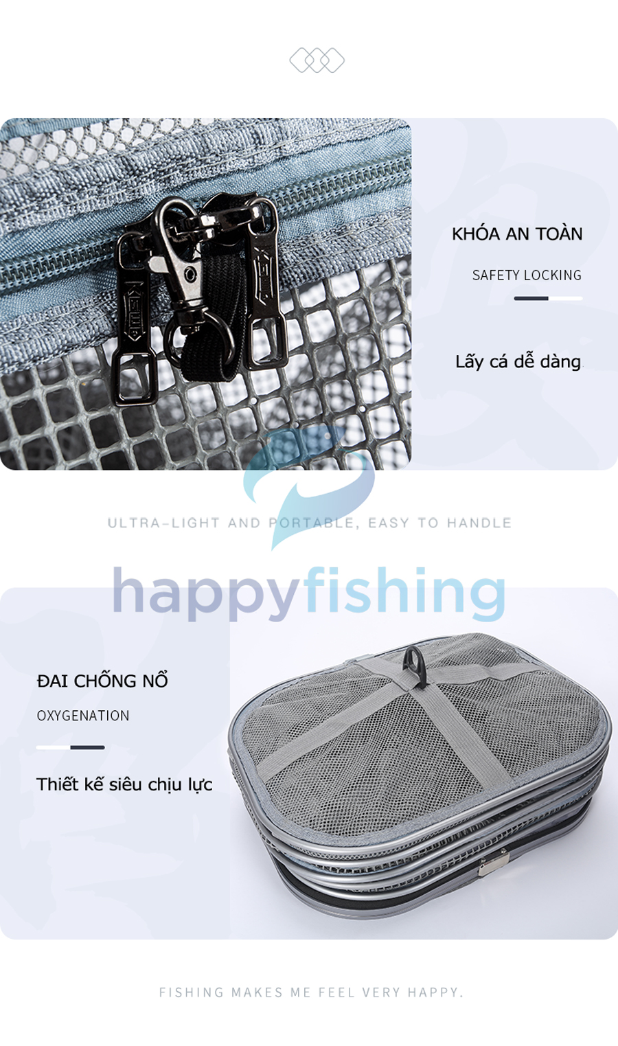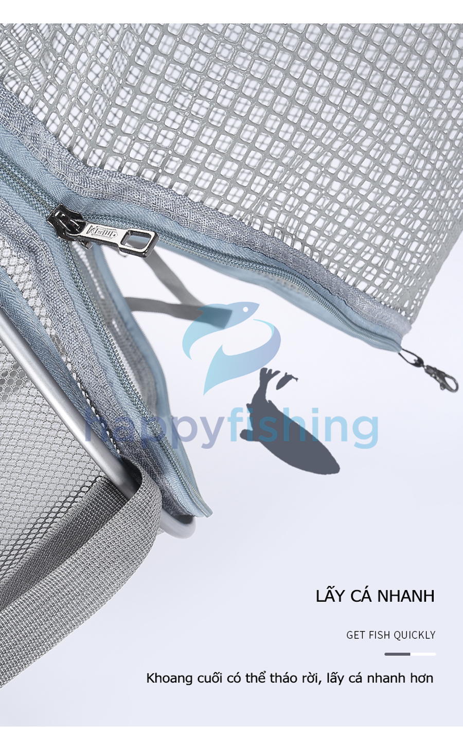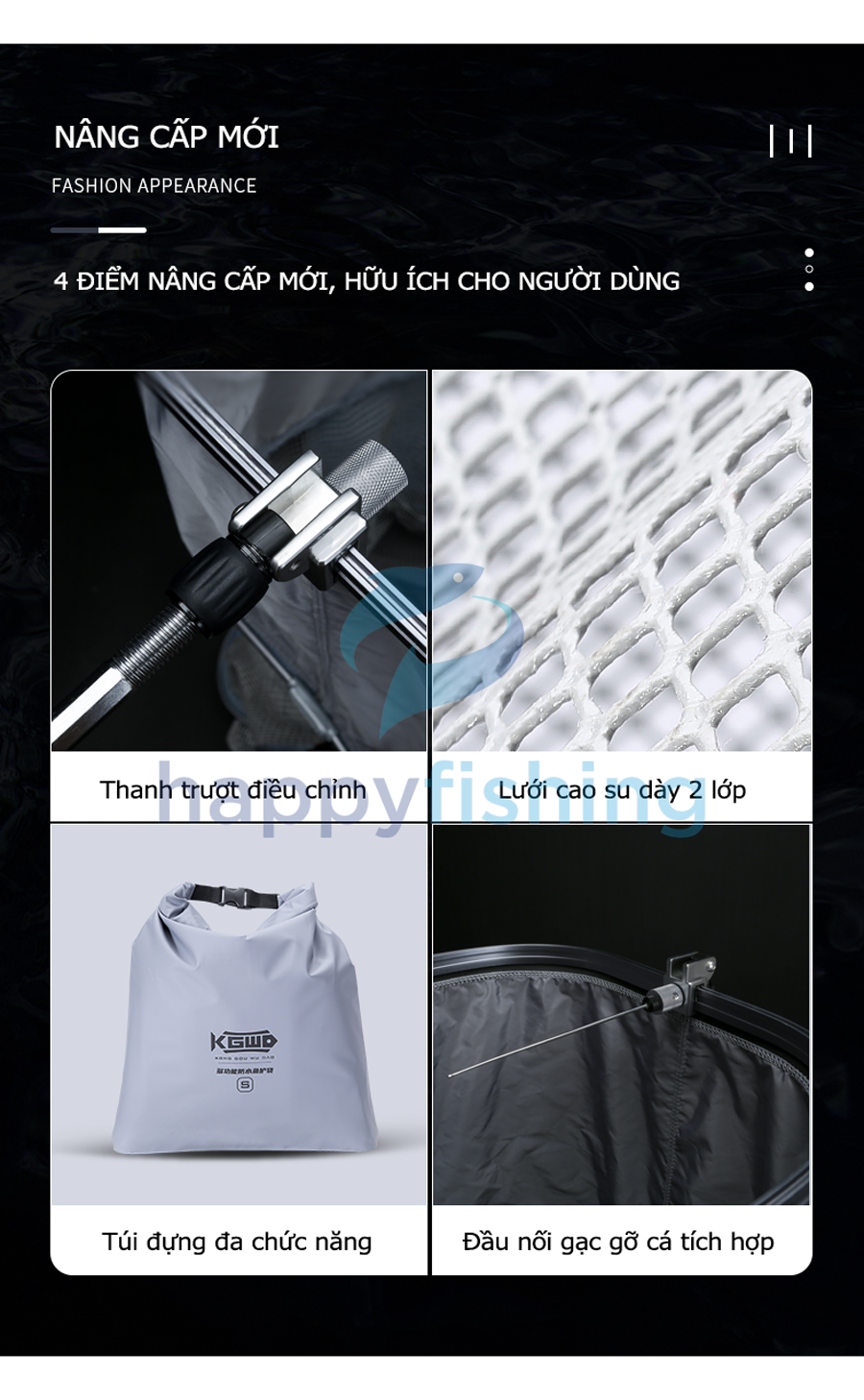 - Bản nâng cấp mới với 4 điểm nổi bật: Thanh trượt có thể điều chỉnh, lưới nano dày 02 lớp, tích hợp kèm túi đựng đa chức năng và đầu nối gạt cá tốc độ
