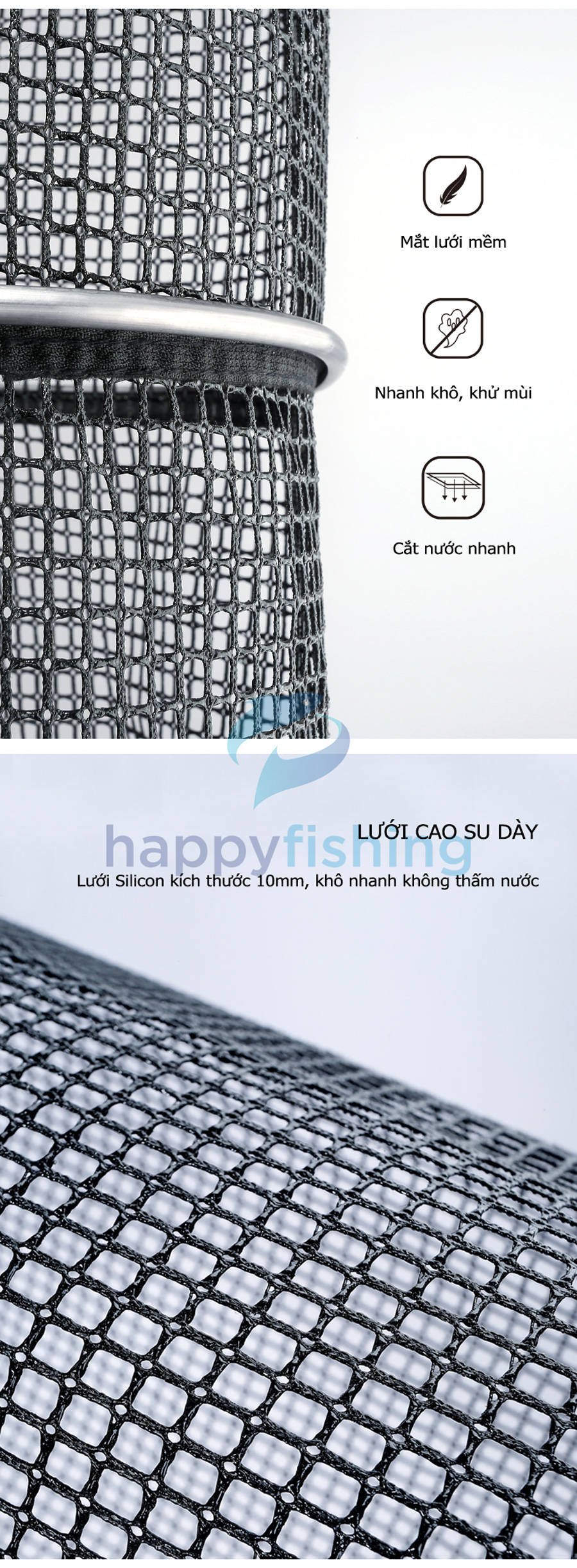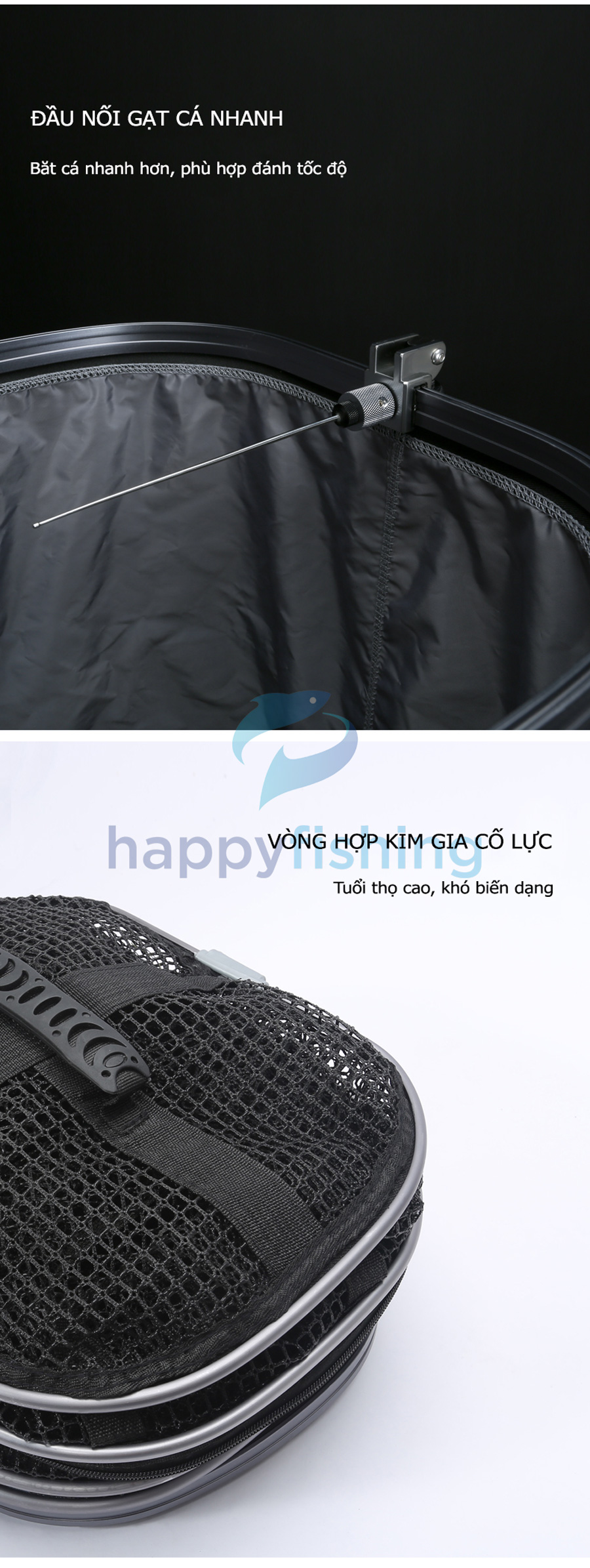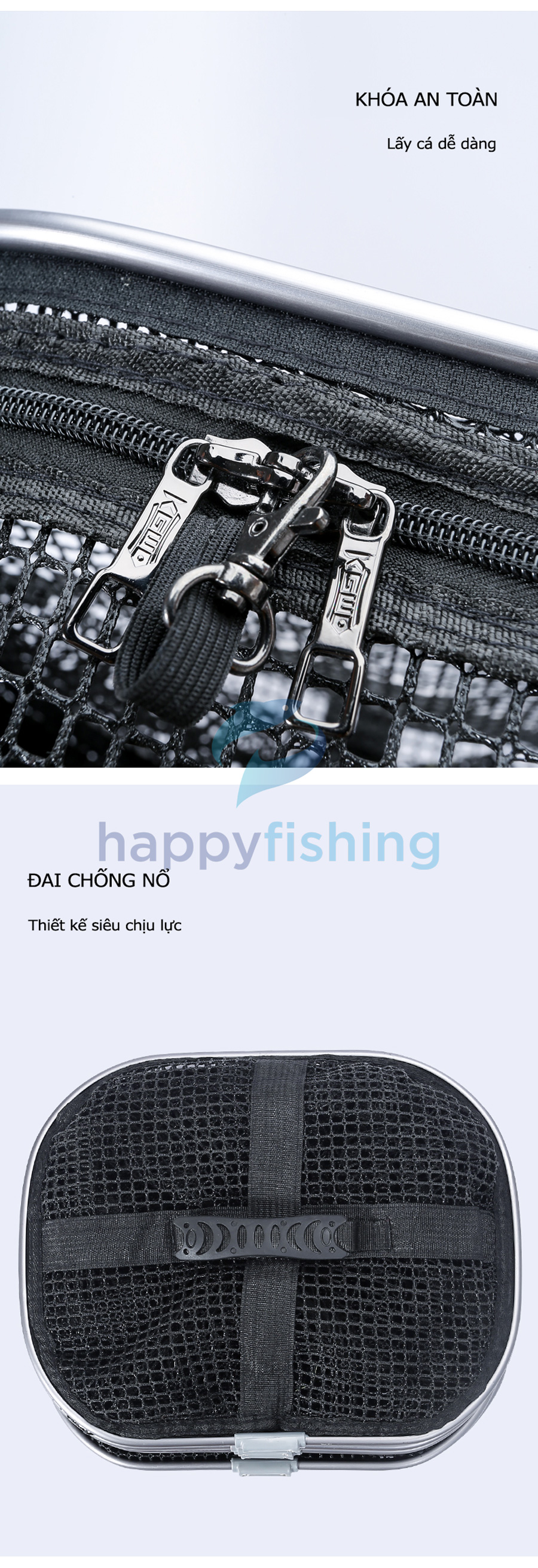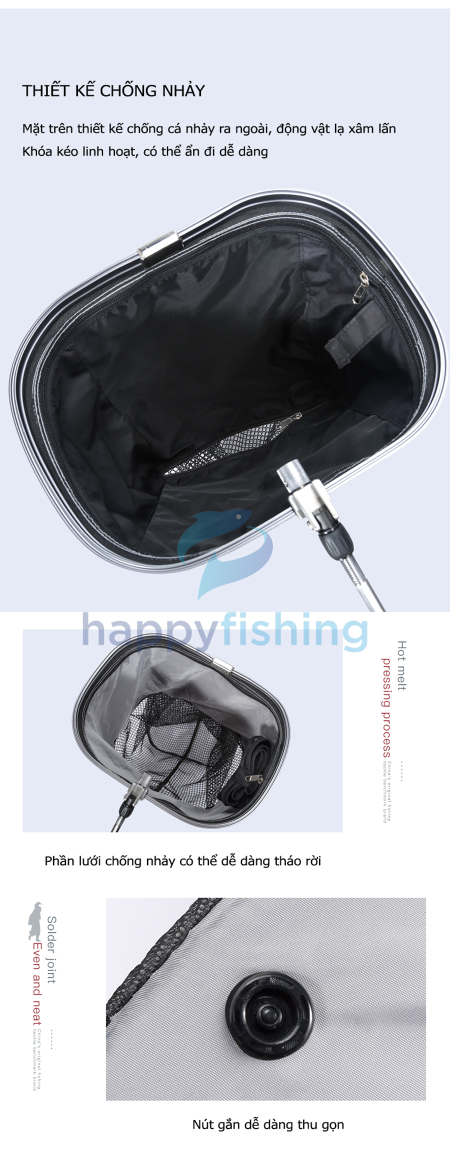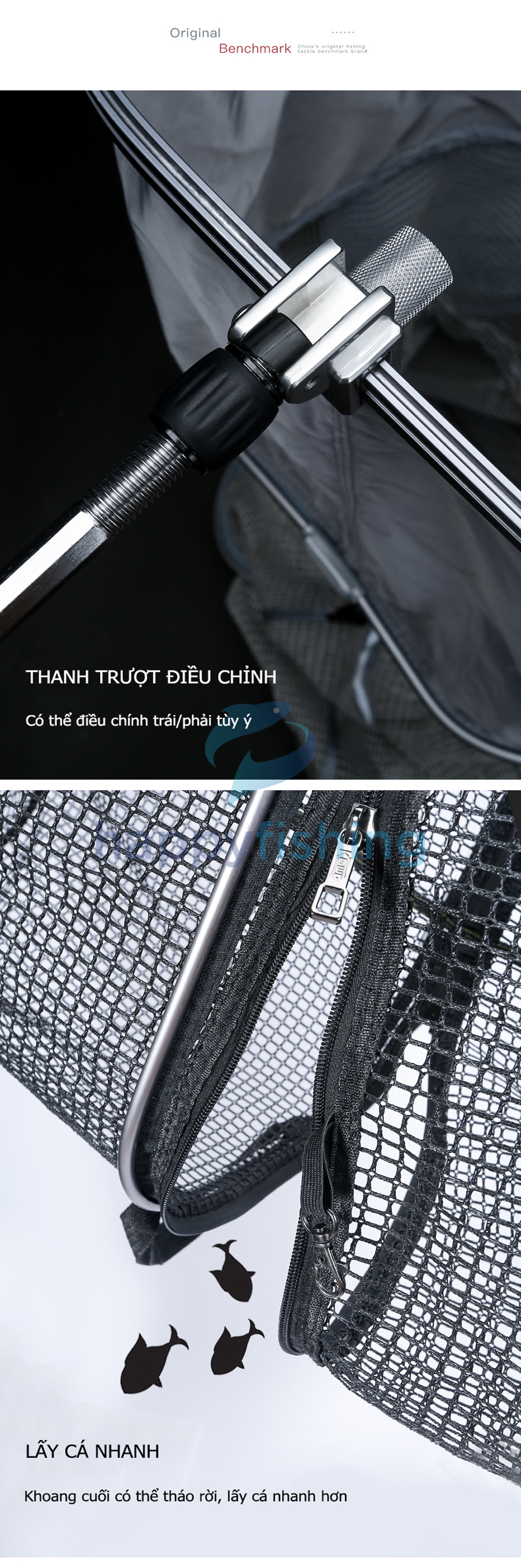 - Bản nâng cấp mới với 4 điểm nổi bật: Thanh trượt có thể điều chỉnh, lưới Silicon dày 02 lớp, tích hợp kèm túi đựng đa chức năng và đầu nối gạt cá tốc độ
